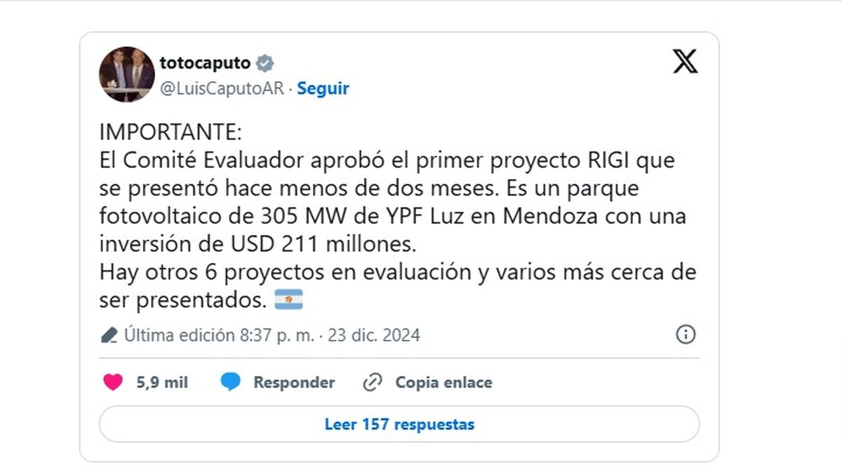 La confirmación llegó al promediar el lunes. Caputo posteó en X: "Importante: El Comité Evaluador aprobó el primer proyecto de RIGI que se presentó hace dos meses. Es un parque fotovoltaico de 305 MW de YPF Luz en Mendoza, con una inversión de 211 millones de dólares. Hay otros 6 proyectos en evaluación y varios más cerca de ser presentados".