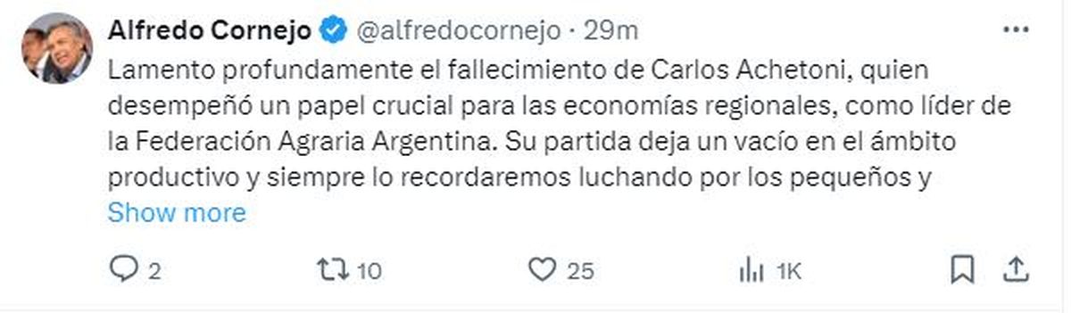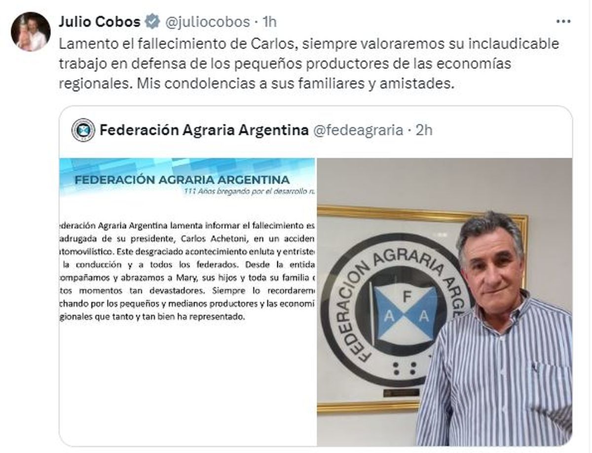 Desde la FAA lamentaron el deceso de Achetoni y expresaron: "Siempre lo recordaremos luchando por los pequeños y medianos productores y las economías que tanto y tan bien ha representado".