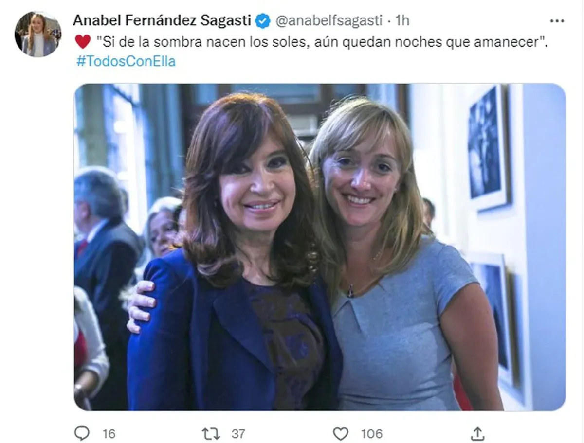 Por su lado, la aún presidenta partidaria, Anabel Fernández Sagasti, eligió respaldar a la vicepresidenta desde su perfil de Twitter, en donde publicó una foto con Cristina Kirchner con el lema: "Si de la sombra nacen los soles, aún quedan muchas noches que amanecer". La frase pertenece a la canción Pole de la banda de rock La Renga.