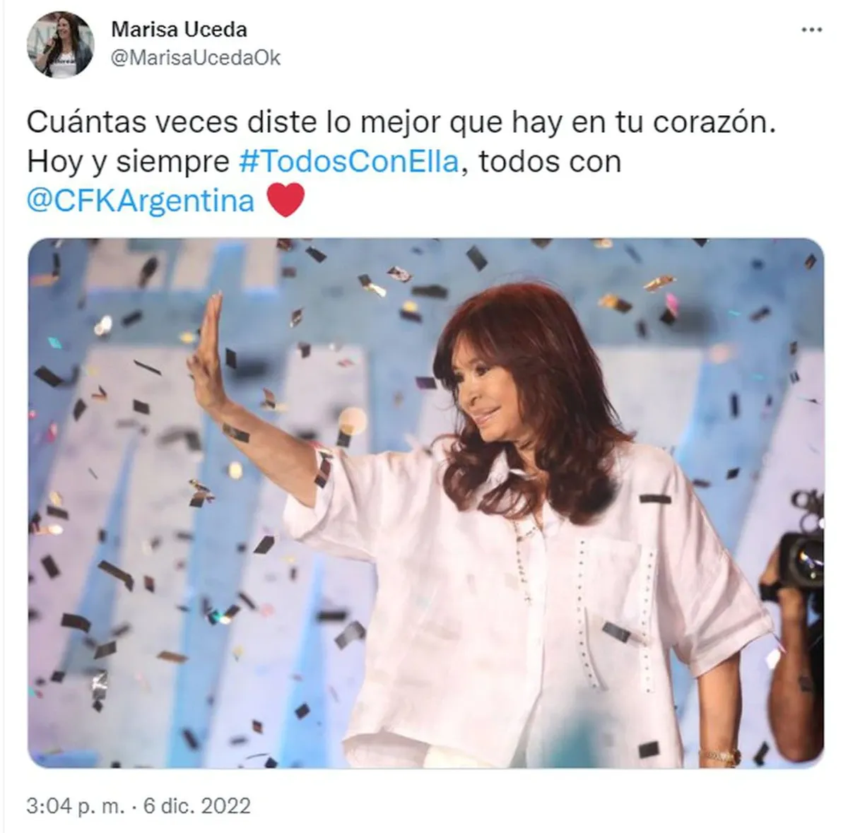 También la diputada nacional kirchnerista, Marisa Uceda, salió a apoyar a la vicepresidenta con la frase "Cuantas veces diste lo mejor que hay en tu corazón. Hoy y siempre #todosconella".