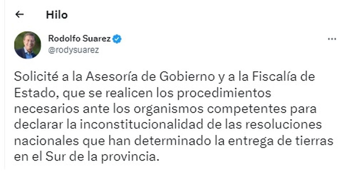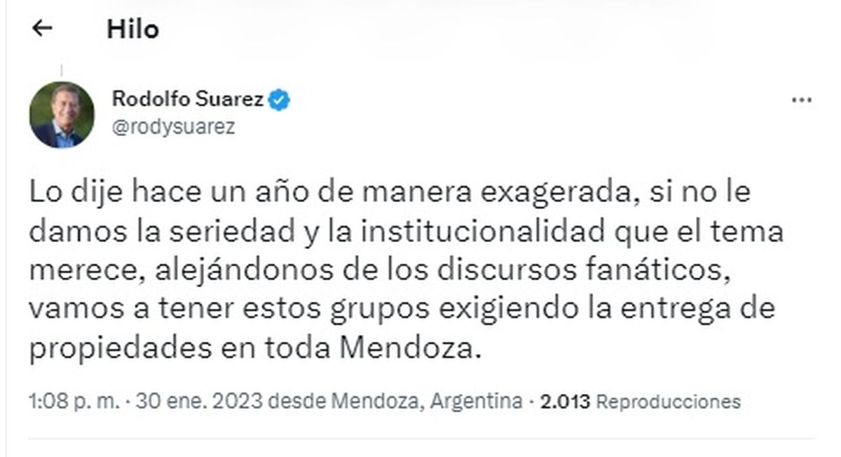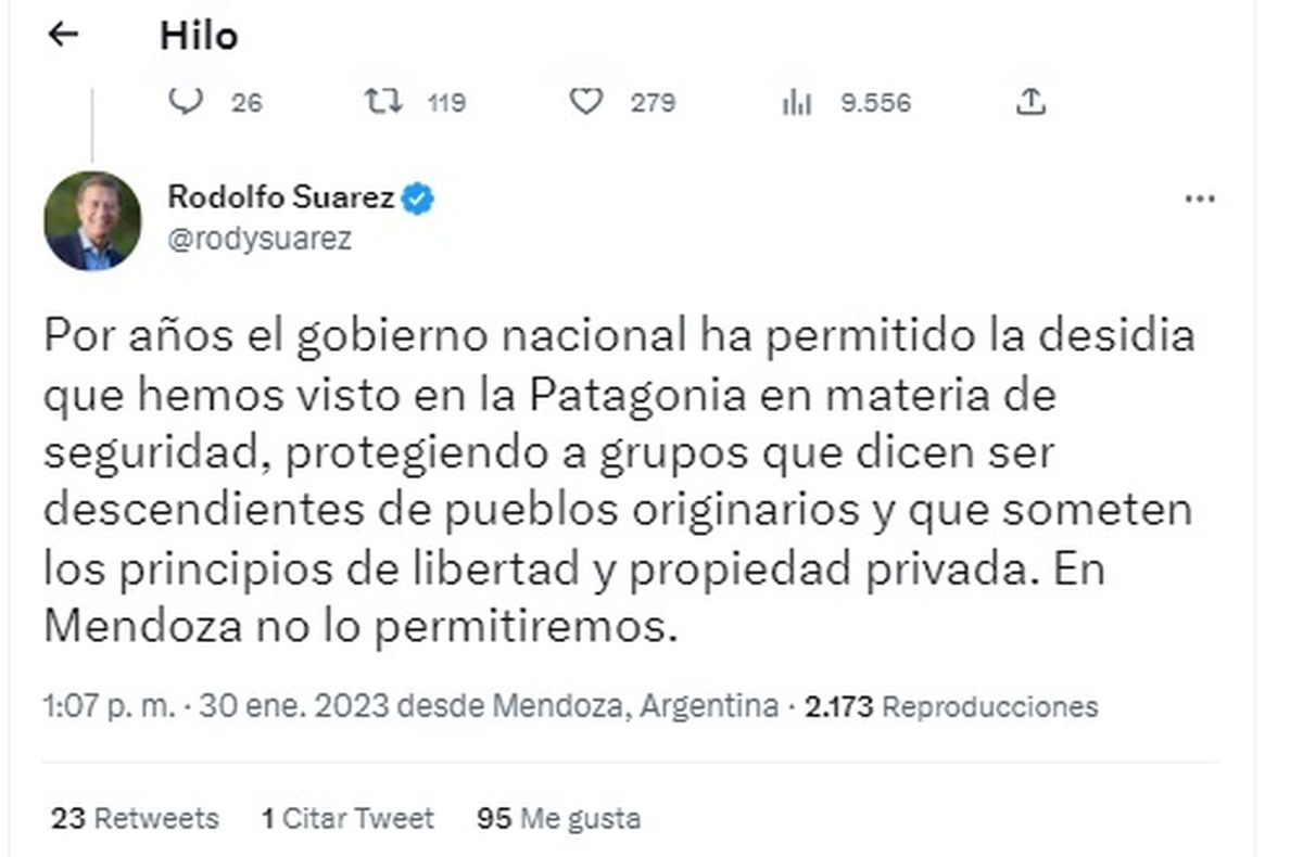 Según consta en el hilo de Twitter publicado en la cuenta oficial del Gobernador, este asegura que no va a permitir que en Mendoza ocurra lo mismo que sucede en el Sur del país con respecto a los mapuches.