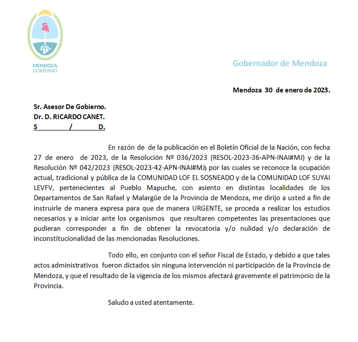 En ella, Suarez consignó que ambos funcionarios del Estado deben trabajar para pedir la inconstitucionalidad de las resoluciones 036/23 y 042/23, ambas del Poder Ejecutivo Nacional, por las cuales se reconoce la ocupación actual, tradicional y pública de la comunidad Lof El Sosneado y de la comunidad Lof Suyai Leufu, por parte del pueblo mapuche.