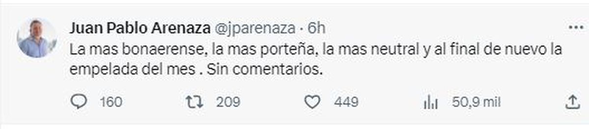 "La más bonaerense, la más porteña, la más neutral y al final de nuevo la empleada del mes. Sin comentarios", escribió Arenaza en su cuenta oficial de Twitter, sin mencionarla, pero haciendo clara referencia a la exg obernadora bonaerense.