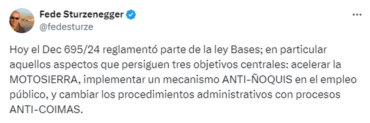 Sturzenegger, aseguró que el decreto que reglamenta la ley Bases sobre la reforma del Estado permitirá alcanzar "tres objetivos centrales: acelerar la MOTOSIERRA, implementar un mecanismo ANTI-ÑOQUIS en el empleo público, y cambiar los procedimientos administrativos con procesos ANTI-COIMAS".
