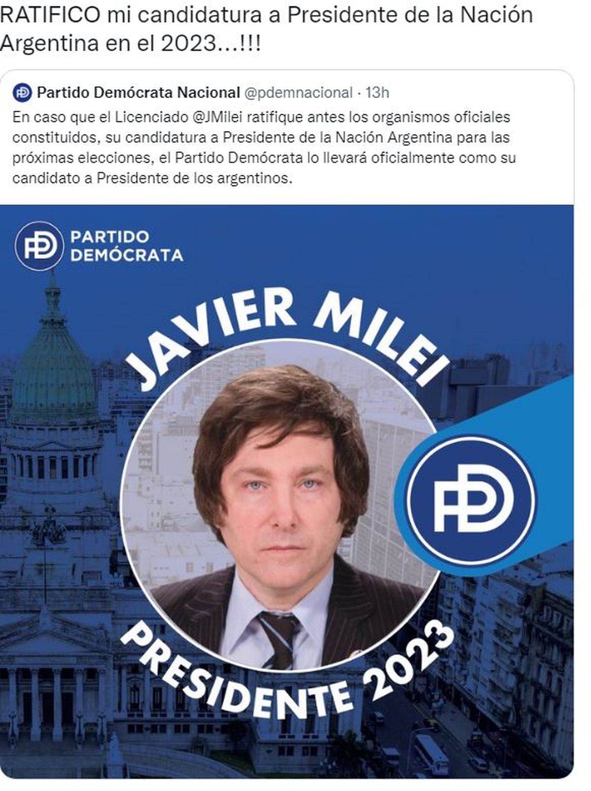 "En caso que el licenciado Javier Milei ratifique ante los organismos oficiales constituidos, su candidatura a presidente de la Nación Argentina para las próximas elecciones, el Partido Demócrata lo llevará oficialmente como su candidato a Presidente de los argentinos", informaron desde el PD nacional y enseguida llegó la respuesta de Milei, en un mensaje de Twitter:
