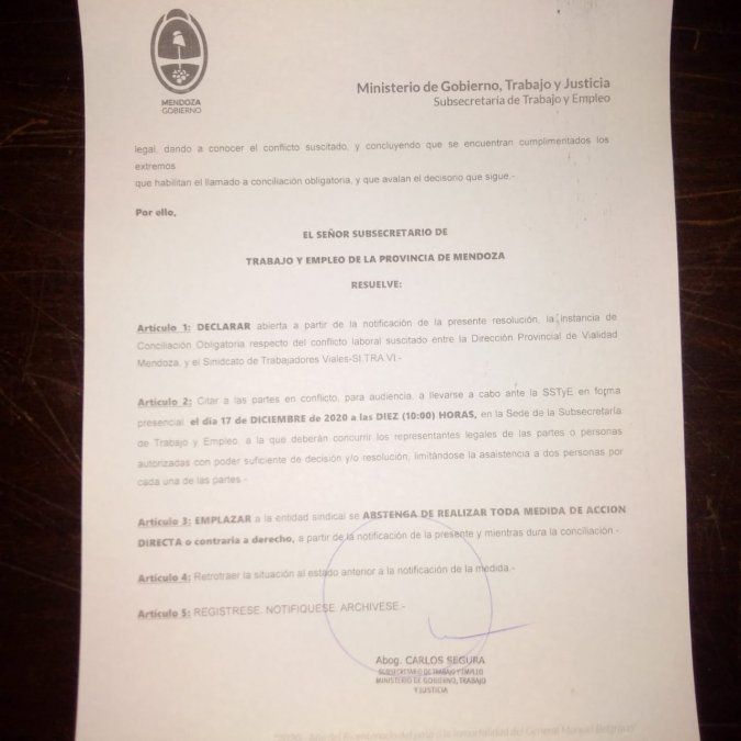 Tras una reunión de casi dos horas, la Subsecretaría de Trabajo dictó la conciliación obligatoria en el conflicto entre el Sitravi (Sindicato de Trabajadores Viales) y la Dirección Provincial de Vialidad. Además, dispuso convocar a una nueva reunión de partes para el jueves 17 y emplazó al gremio a que se abstenga de realizar medidas de fuerza, por lo menos hasta el nuevo encuentro que se hará en dos días más.