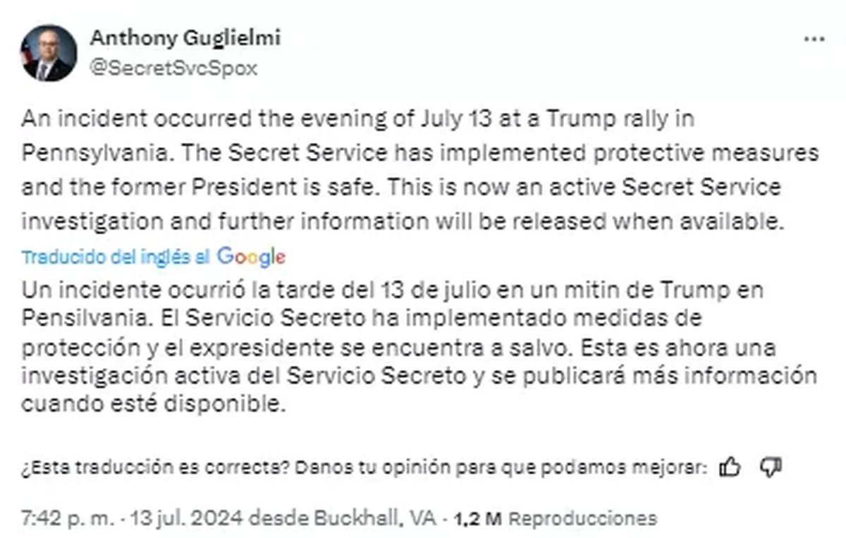 "Un incidente ocurrió la tarde del 13 de julio en un mitin de Trump en Pensilvania. El Servicio Secreto ha implementado medidas de protección y el expresidente se encuentra a salvo. Esta es ahora una investigación activa del Servicio Secreto y se publicará más información cuando esté disponible", publicó Anthony Guglielmi, jefe de Comunicaciones del Servicio Secreto de los Estados Unidos.