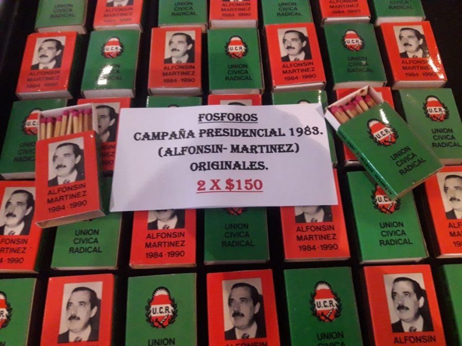 Aquí se comercializa desde fósforos con la foto de campaña de Raúl Ricardo Alfonsín de 1983 hasta libros del ex presidente que comenzó ese año su mandato o de Arturo Illìa, pasando por llaveros o escudos de cobre con base de mármol por la módica suma de $2.999.