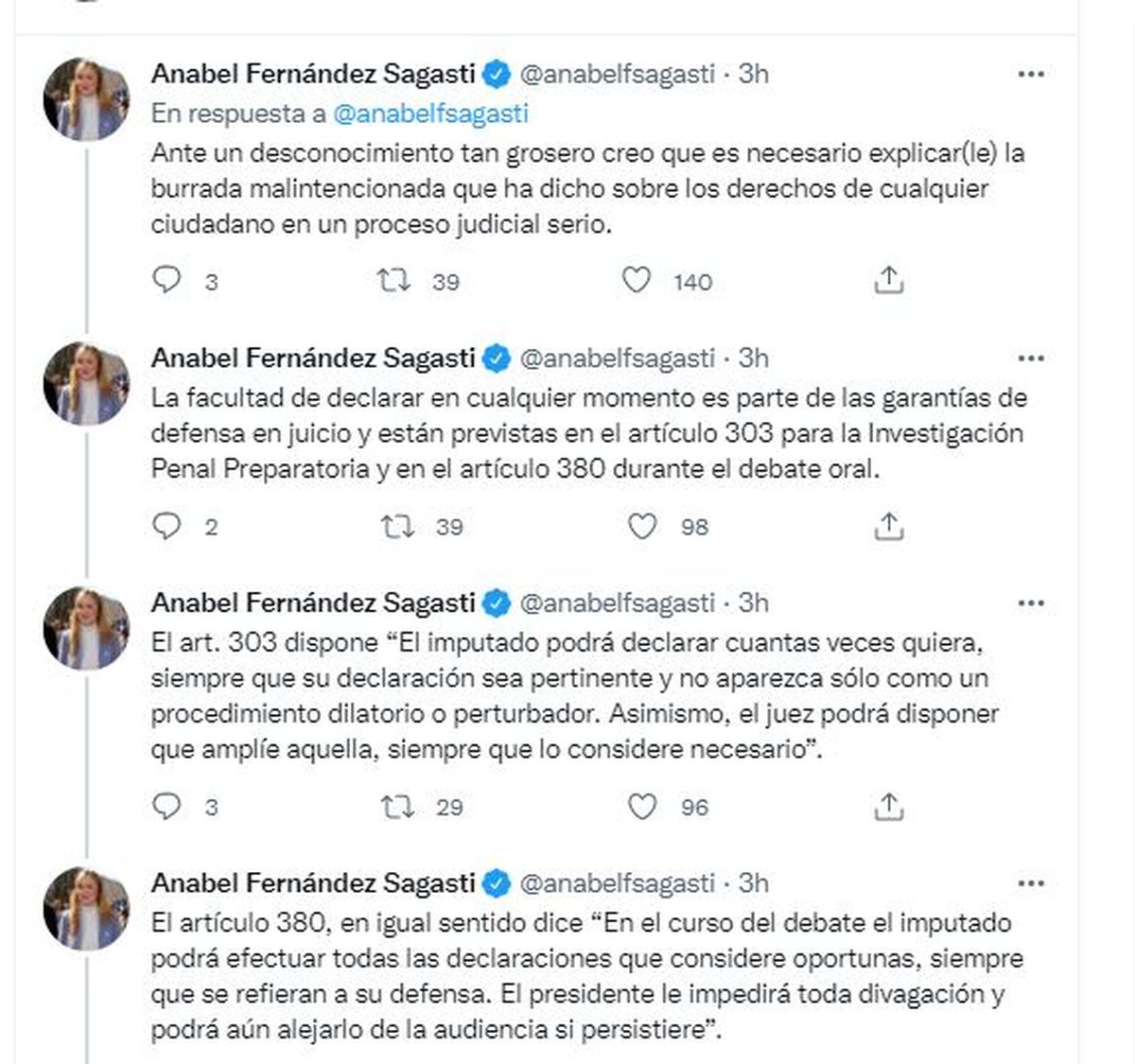 La legisladora kirchnerista publicó un largo hilo de Twitter describiendo algunos artículos del Código Procesal Penal y sin ahorrar críticas al referente radical como la de tener un "desconocimiento grosero".