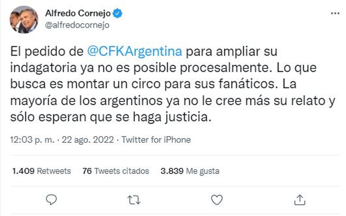 "El pedido de Cristina Fernández de Kirchner para ampliar su indagatoria ya no es posible procesalmente. Lo que busca es montar un circo para sus fanáticos. La mayoría de los argentinos ya no le cree más su relato y sólo esperan que se haga justicia", publicó en redes sociales el ex gobernador de Mendoza.