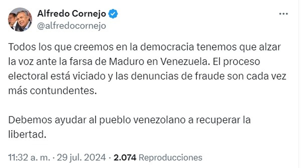 Las declaraciones fueron en sintonía con un tuit que el radical publicó más temprano y que se refería a la "farsa de Maduro".