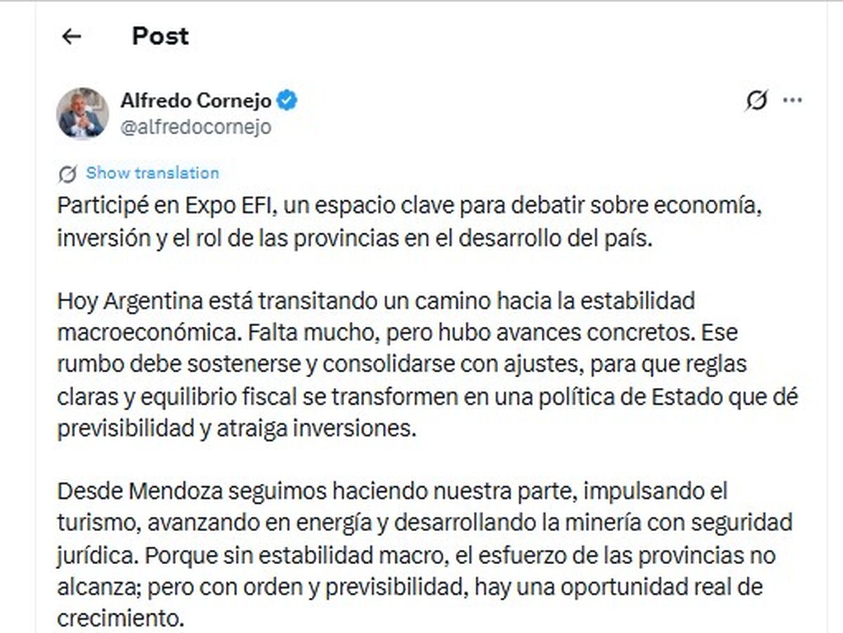 Mientras tanto, el foco del discurso oficial sigue puesto en sostener el equilibrio fiscal y en consolidar un marco de previsibilidad que, según el propio Alfredo Cornejo, resulta clave para generar condiciones de inversión y crecimiento tanto a nivel nacional como provincial.
