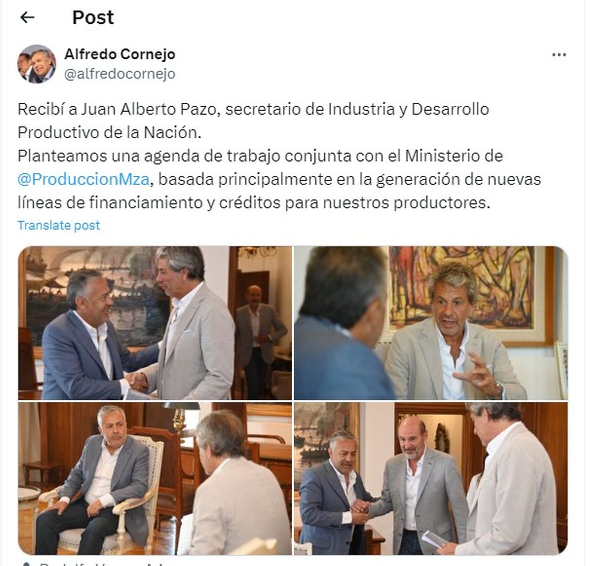 Alfredo Cornejo se reunió con el secretario de Industria de Milei por líneas de crédito para productores