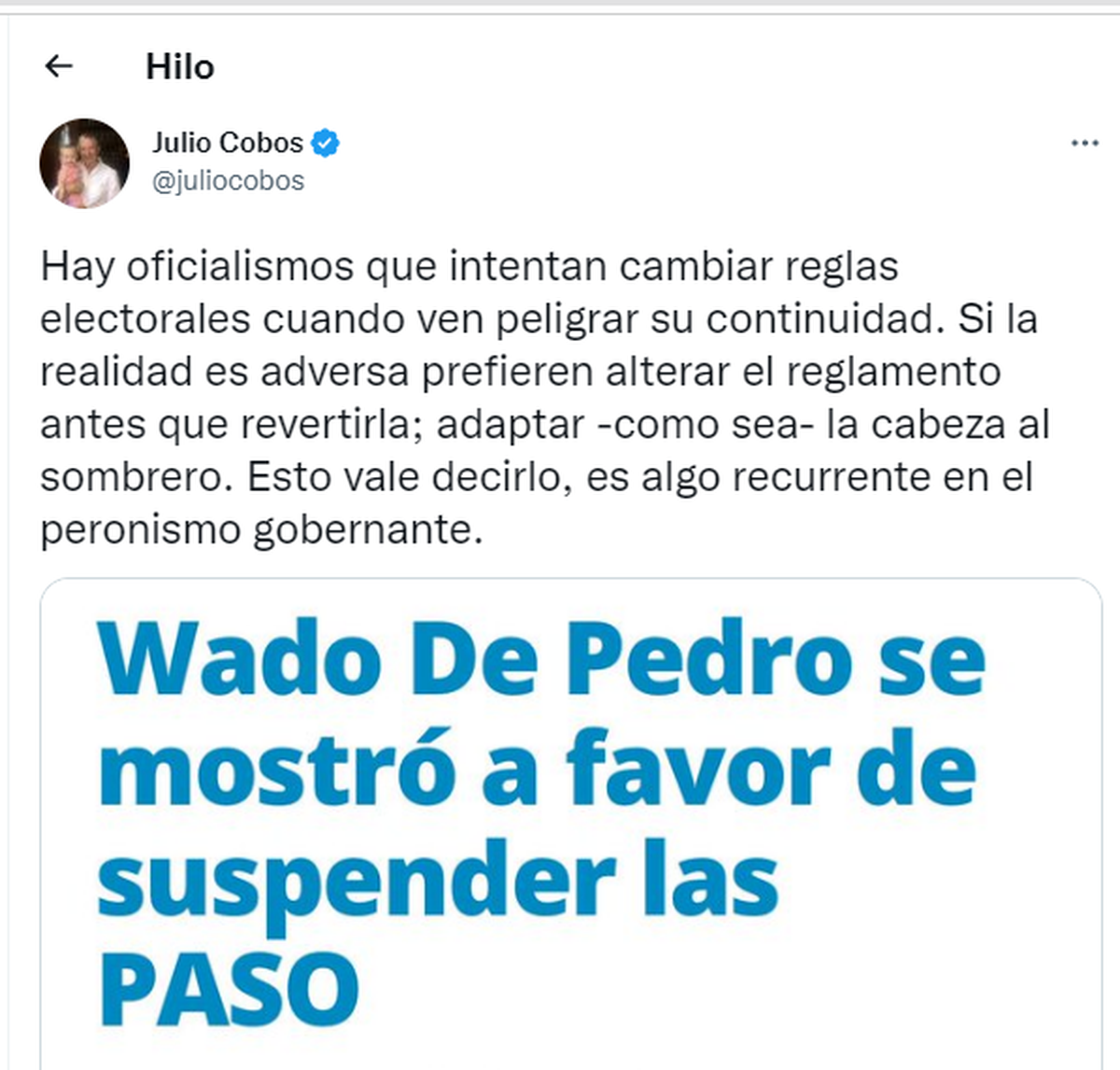 "Hay oficialismos que intentan cambiar reglas electorales cuando ven peligrar su continuidad. Si la realidad es adversa prefieren alterar el reglamento antes que revertirla; adaptar -como sea- la cabeza al sombrero. Esto vale decirlo, es algo recurrente en el peronismo gobernante"
