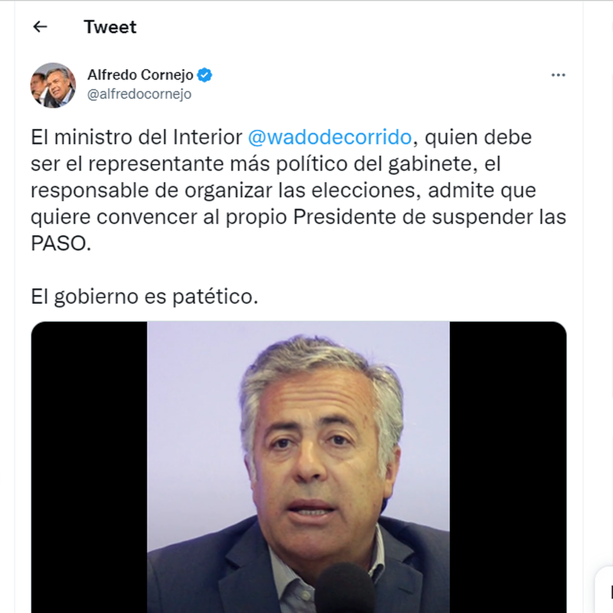 Consultado puntualmente por los dichos del ministro del interior Wado De Pedro, quien aseguró que "iban a tratar de convencer al presidente Alberto Fernández de cambiar la ley de las PASO", Alfredo Cornejo describió la situación como "patética".