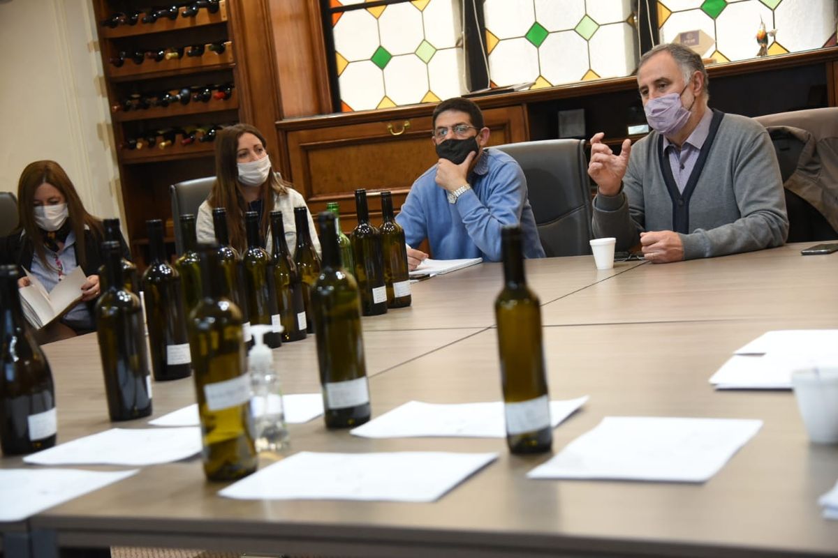 El vicegobernador Mario Abed y los subsecretarios de Agricultura y Ganadería y de Industria y Comercio del Ministerio de Economía y Energía, Sergio Moralejo y Alejandro Zlotolow respectivamente, junto con el gerente general de Mendoza Fiduciaria, Hernán Norando, y los técnicos de ProMendoza Javier Rojas y Guillermo Martínez se reunió este jueves con representantes de la industria vitivinícola para analizar las muestras de botellas posteriores de España que podrían ser la salvación de las bodegas afectadas por el faltante de envases en Mendoza.