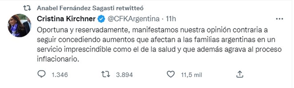 Pero conviene empezar por el principio. Después de que el gobierno nacional permitiera esta semana un aumento en las cuotas que pagan los usuarios de empresas de medicina prepaga, la expresidenta escribió lo siguiente: