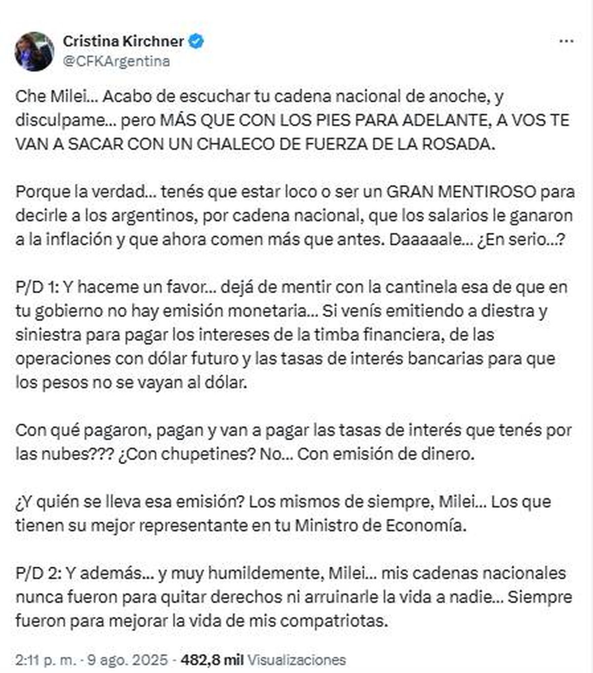Para finalizar, la ex mandataria sintentizó: “P/D 2: Y además… y muy humildemente, Milei… mis cadenas nacionales nunca fueron para quitar derechos ni arruinarle la vida a nadie… Siempre fueron para mejorar la vida de mis compatriotas”.