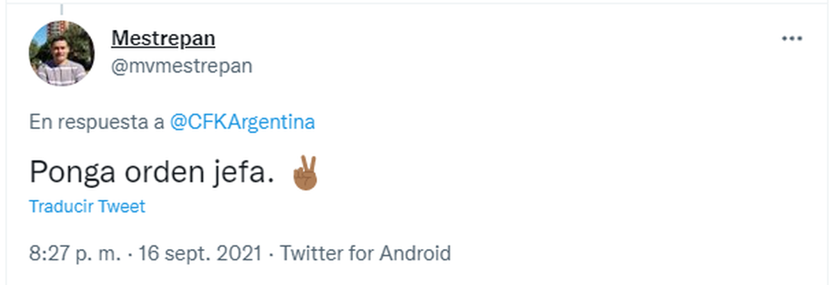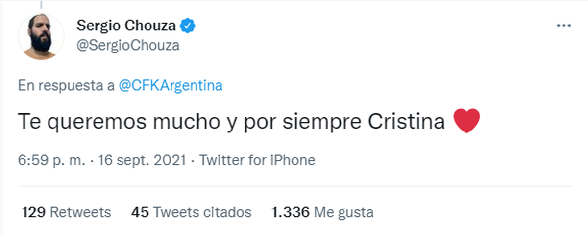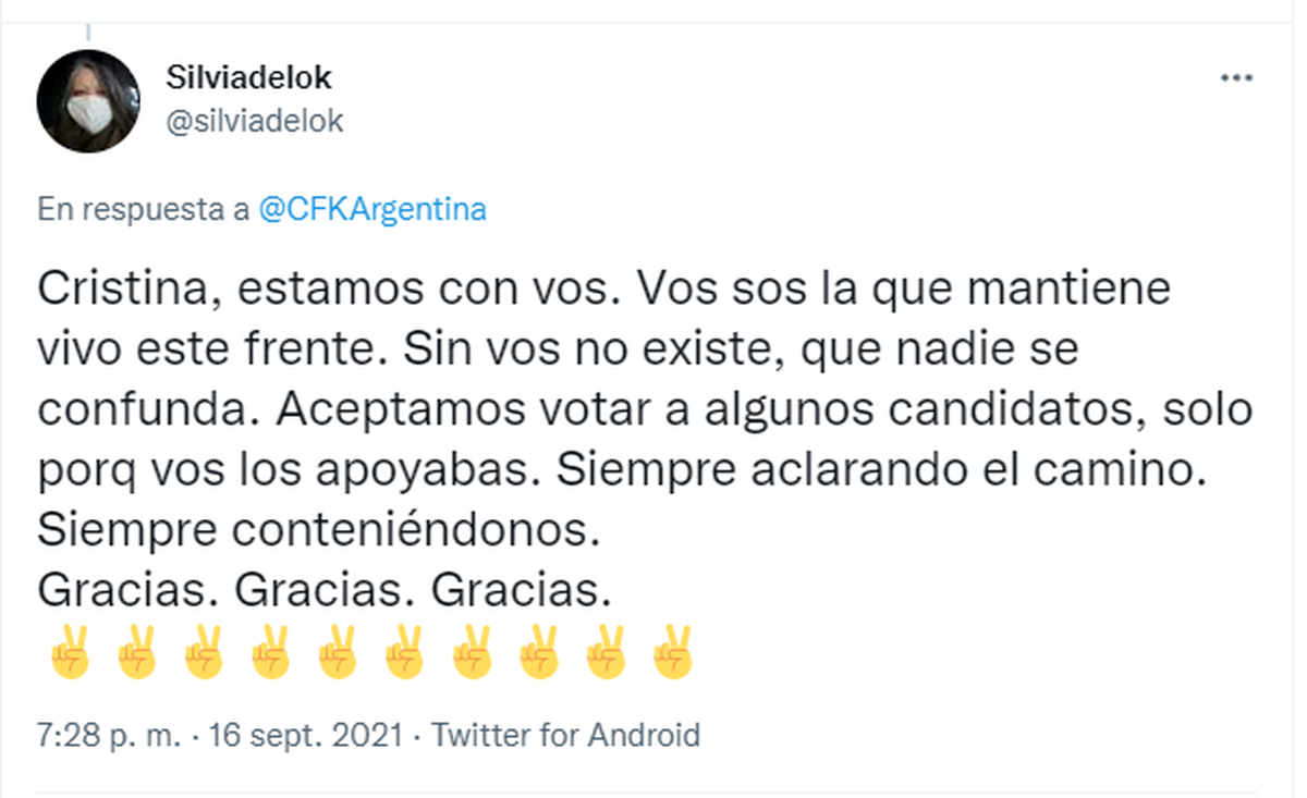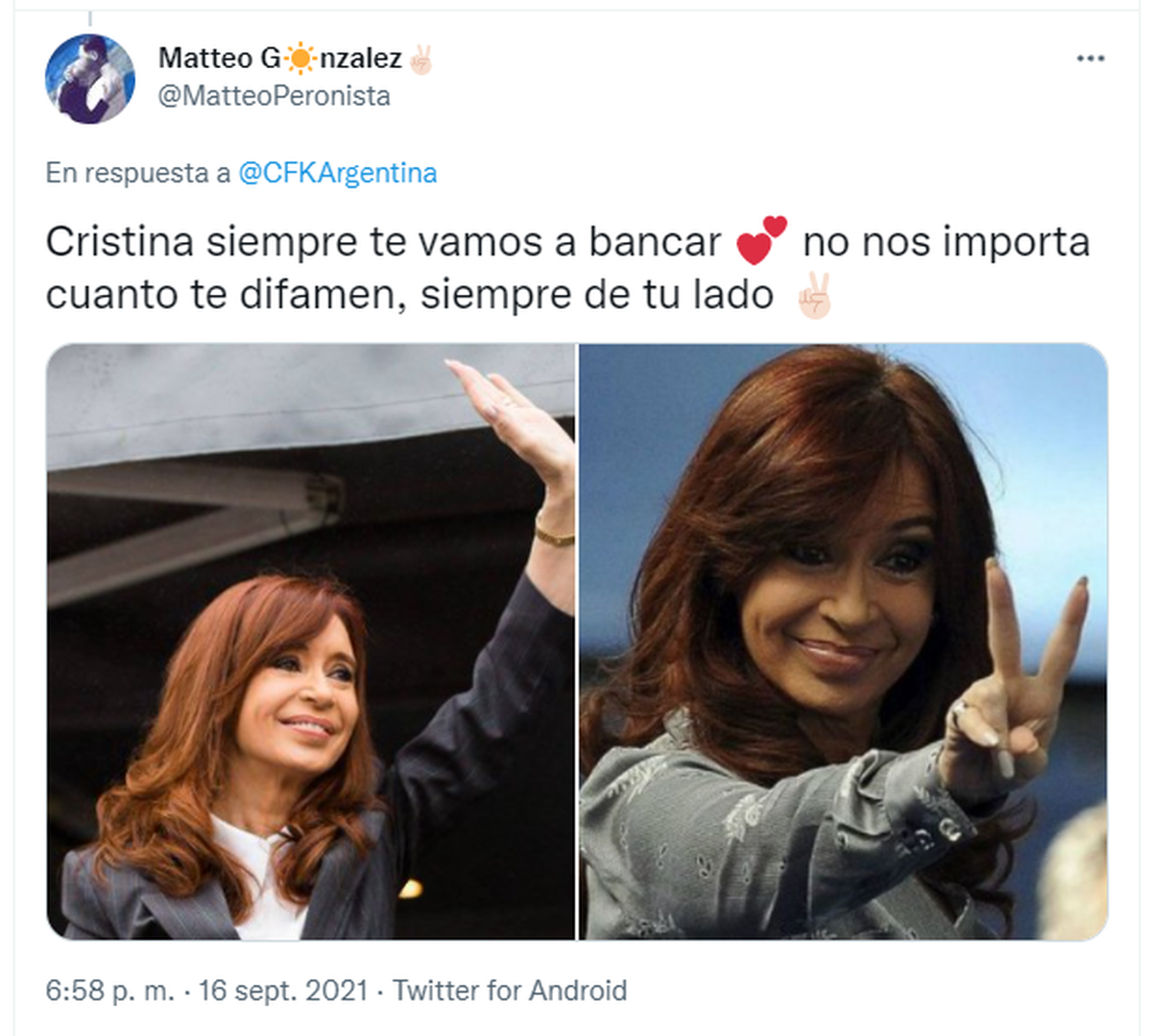 "Te queremos mucho y por siempre Cristina", "Cristina, estamos con vos. Vos sos la que mantiene vivo este frente. Sin vos no existe, que nadie se confunda. Aceptamos votar a algunos candidatos, solo porq vos los apoyabas. Siempre aclarando el camino. Siempre conteniéndonos. Gracias", "Cristina siempre te vamos a bancar no nos importa cuanto te difamen, siempre de tu lado", "Ponga orden jefa", fueron algunos de los tuits con buenas ondas hacía CFK.