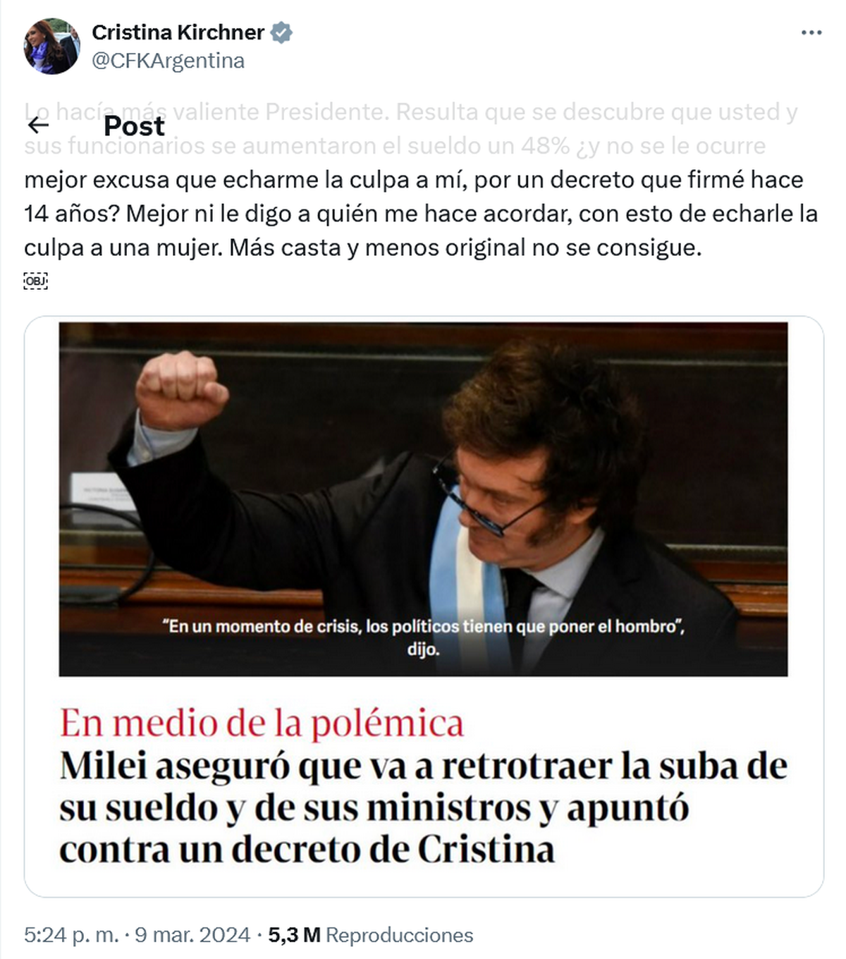 Minutos después, la líder de Unión por la Patria le retrucó: "Usted quiere pelearse conmigo para que no hablemos del decreto que firmó dándose un aumento del 48% a usted y a sus funcionarios mientras pulveriza las jubilaciones y los salarios de los argentinos... y de las argentinas también. Admita que firmó, cobró y lo pescaron".