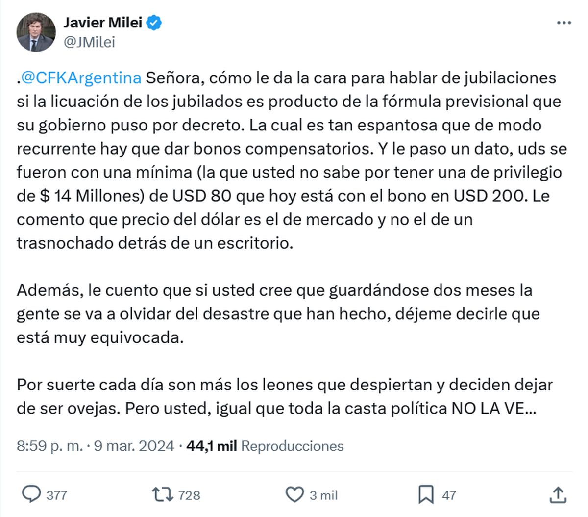 Milei, luego de que le informaran del mensaje de Cristina, no se quedó callado y también apuntó contra la expresidenta además de revelar que Cristina lo tiene bloqueado en X (Twitter): "Señora, para hablar de valentía primero tiene que nombrar a la gente que critica y después desbloquearme en Twitter".