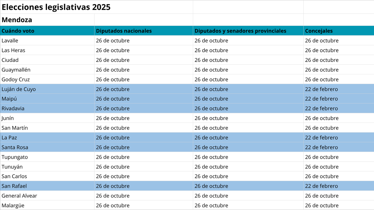 Después de que el gobernador Alfredo Cornejo definiera el calendario electoral provincial unificado con el de la Nación, los 18 intendentes decidieron cuándo se votan concejales en sus departamentos.