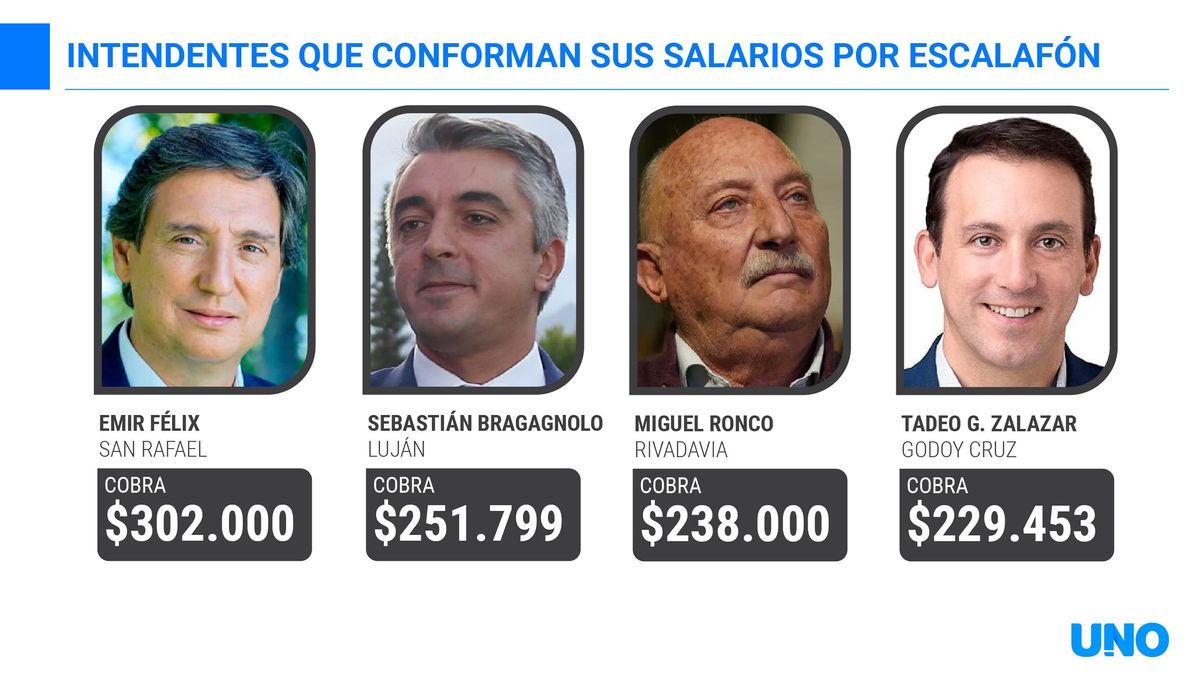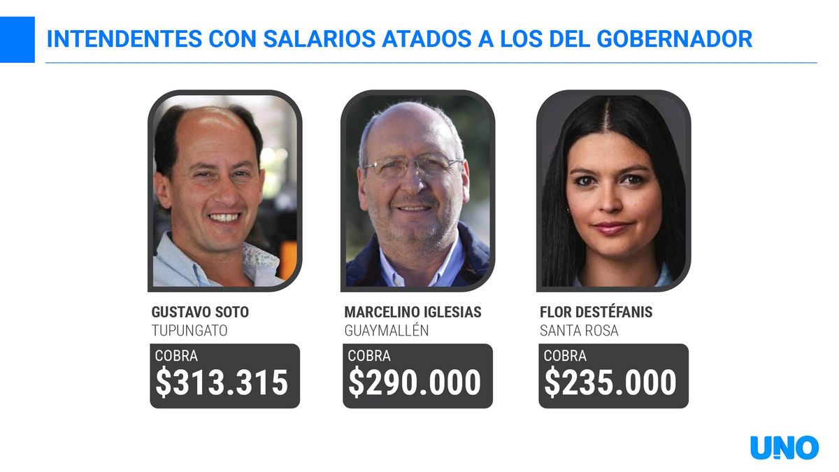 En ese terna figuran el intendente de Tupungato, Gustavo Soto (UCR), que en el último mes percibió $313.315; el jefe comunal de Guaymallén, Marcelino Iglesias (UCR) que cobró $290.000 y la intendenta de Santa Rosa, Flor Destéfanis (PJ), que tuvo un bono de sueldo de $235.000.