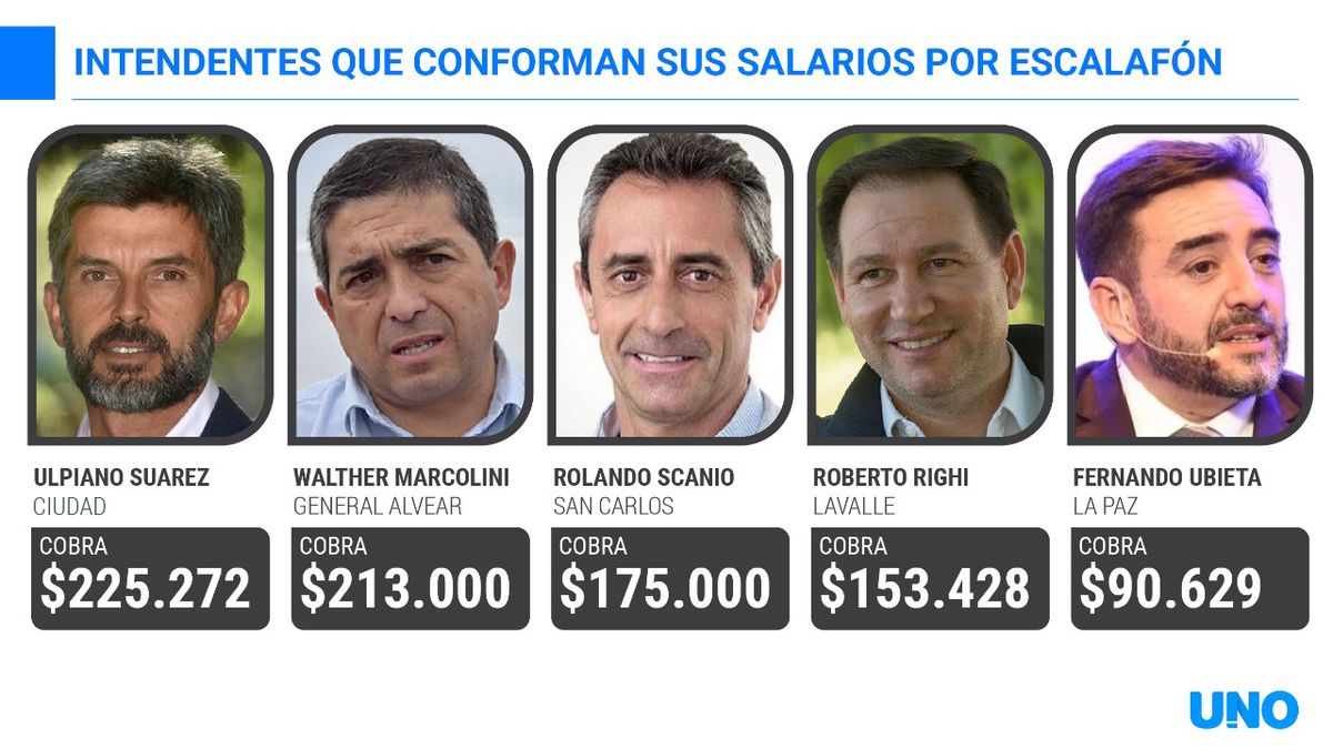 En este grupo de intendentes que fijan sus salarios en base al escalafón municipal figuran también Walther Marcolini (UCR), de General Alvear, que percibió el último mes $213.000. Según la ordenanza que fija su salario, este se compone de dos sueldos de la categoría 13, más un 46% de su título universitario, otro 45% por el ítem de jerarquización, un 100% por Responsabilidad Fiscal y un 85% por mayor dedicación.
