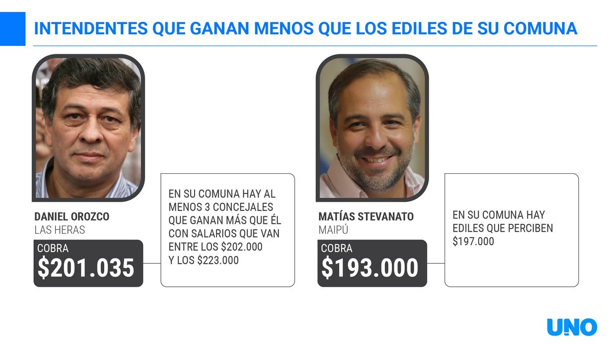 El caso de los intendentes de Las Heras y Maipú también refleja la necesidad de una norma que regule las disparidades. Ellos perciben de salario menos que algunos concejales de su comuna, algo que no parece del todo justo, cuando las responsabilidades de unos y otros son abismalmente distintas.