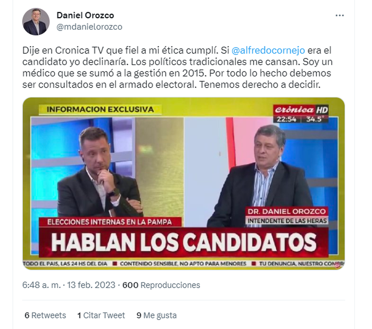 "Dije en Crónica TV que fiel a mi ética cumplí. Si @alfredocornejo era el candidato yo declinaría" comenzó marcando en su publicación y añadió: "Soy un médico que se sumó a la gestión en el 2015. Por todo lo hecho debemos ser consultados en el armado electoral. Tenemos derecho a decidir".