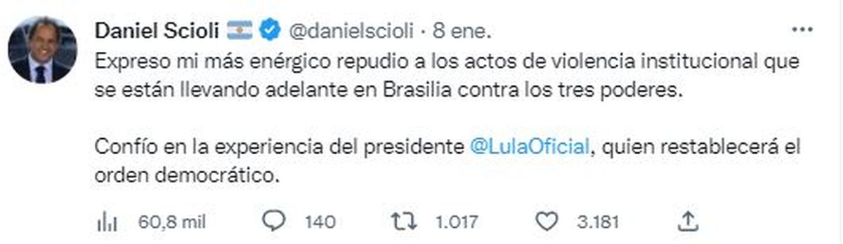 "Con la presidencia de Lula (Da Silva) se viene una profunda integración que va a traer múltiples beneficios para las economías regionales y Mendoza será protagonista en la agenda bilateral", vaticinó, en diálogo con radio Nihuil, el embajador argentino en Brasil, Daniel Scioli.