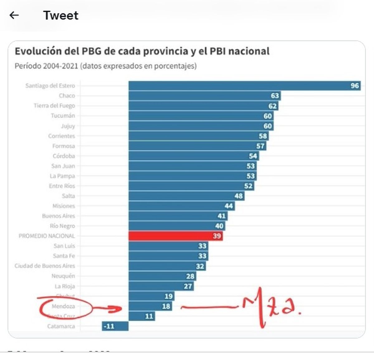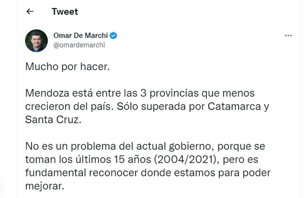 De Marchi lanzó un tuit polémico; criticó el poco crecimiento que ha tenido Mendoza con respecto a las demás provincias del país. De hecho, destacó que está entre las tres que menos crecieron, solo superada por Catamarca y Santa Cruz.
