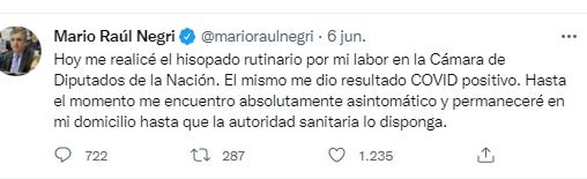Mario Negri tiene coronavirus