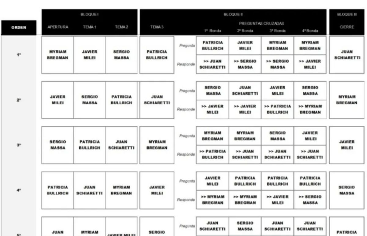 - En 2019, los candidatos no podían llevar ningún machete o ayuda memoria al escenario. Por pedido de Bullrich y Milei, esta vez podrán tener 5 hojas escritas en tamaño 14 de computadora.