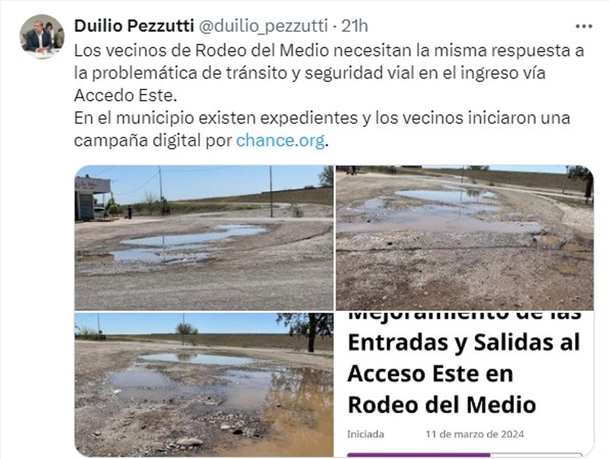 Esta vez los dardos de Pezzutti llegaron a través de las redes sociales, a raíz de un reclamo de vecinos de Rodeo del Medio por una bajada del Acceso Este.