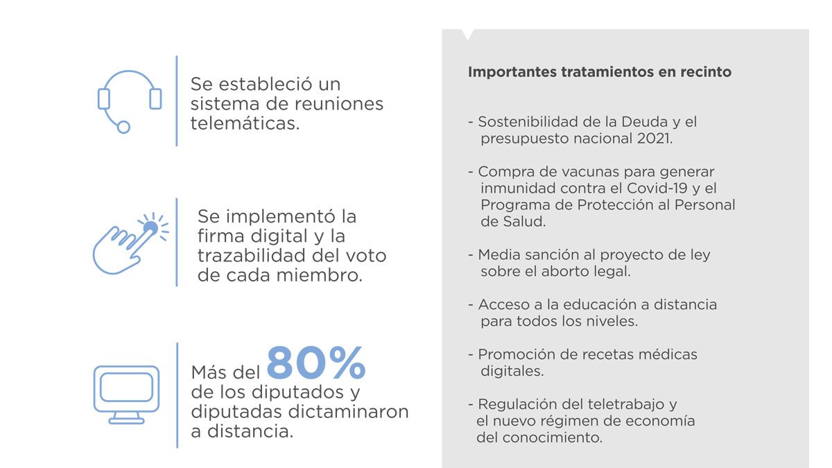 El trabajo remoto, que incluyó reuniones por videoconferencias, la inserción de firmas digitales y la trazabilidad del voto de cada diputado, no solo permitió resguardar la salud de los legisladores y los trabajadores parlamentarios, sino que implicó un salto cualitativo en el proceso de modernización de la Cámara de Diputados.
