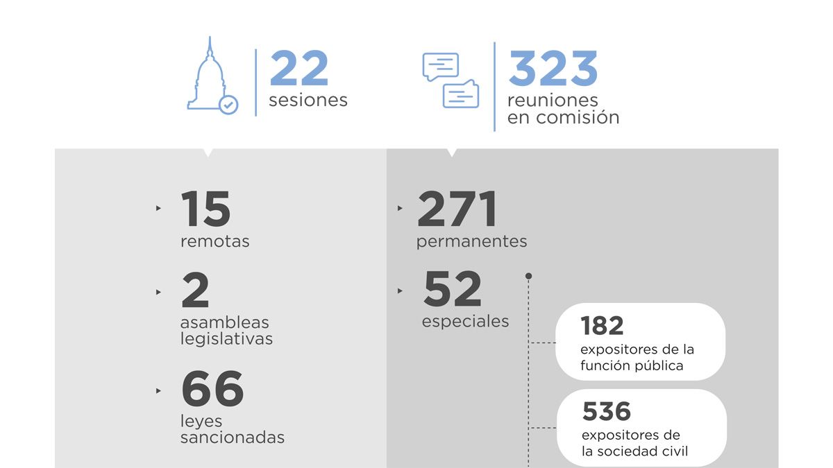 En cuanto al trabajo de las Comisiones, se realizaron un total de 323 reuniones durante el período que va del 10 de diciembre de 2019 a la misma fecha de este año. De ese total, 271 fueron reuniones de comisiones permanentes y 52 corresponden a comisiones especiales.