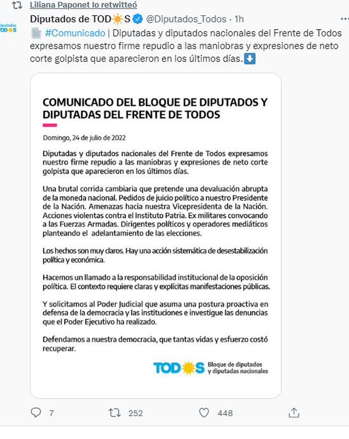 Diputados y diputadas nacionales del Frente de Todos (FDT) expresaron este domingo su "firme repudio" ante lo que consideraron "maniobras y expresiones de neto corte golpista que aparecieron en los últimos días, y llamaron al Poder Judicial a "asumir una postura proactiva en defensa de la democracia y las instituciones".