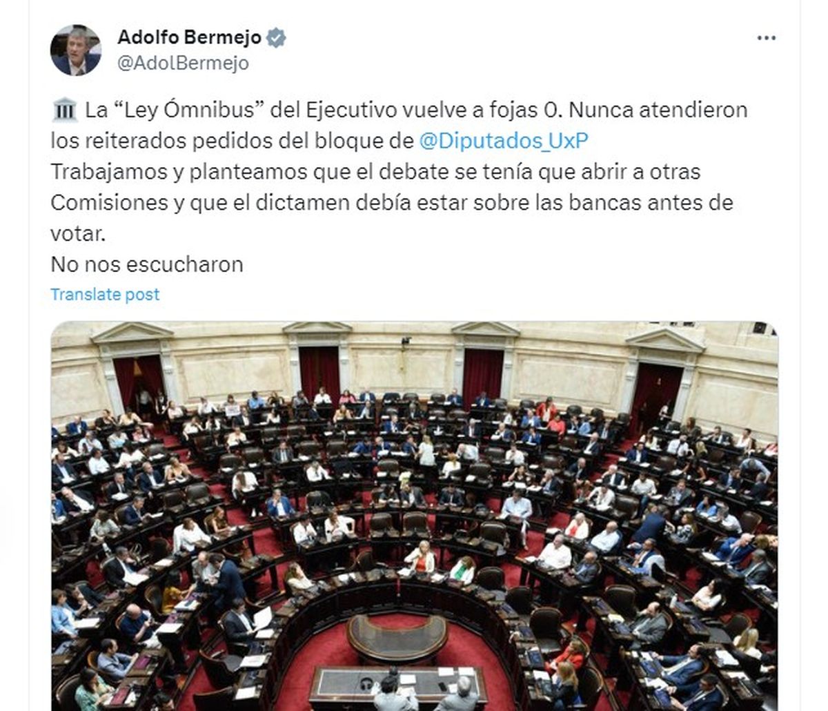 Bermejo se quejó de que no fueron escuchados durante el debate. "Esta falta de escucha dio como resultado la vuelta a foja cero del proyecto de Ley Ómnibus", consideró.