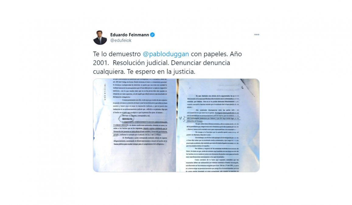 "Te lo demuestro @pabloduggan con papeles. Año 2001. Resolución judicial. Denunciar denuncia cualquiera. Te espero en la justicia", dijo junto a los documentos que muestran el sobreseimiento en la causa en la que se lo denunciaba por haber forzado la interrupción de un embarazo.