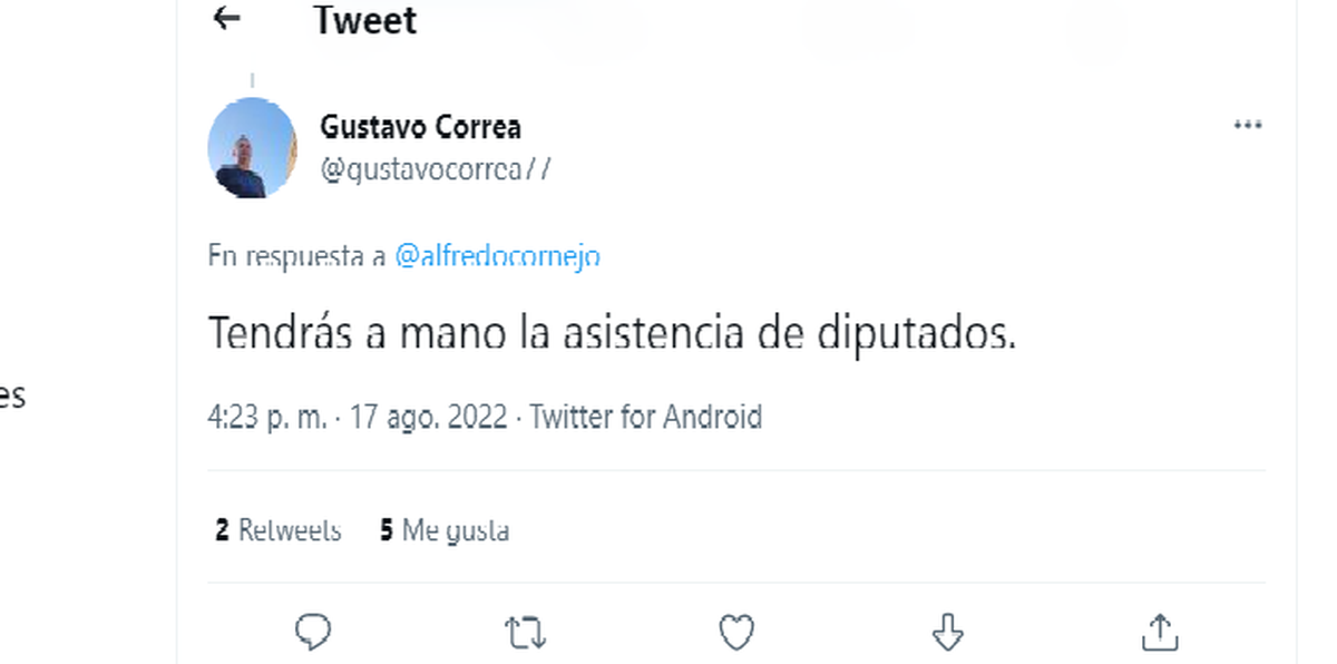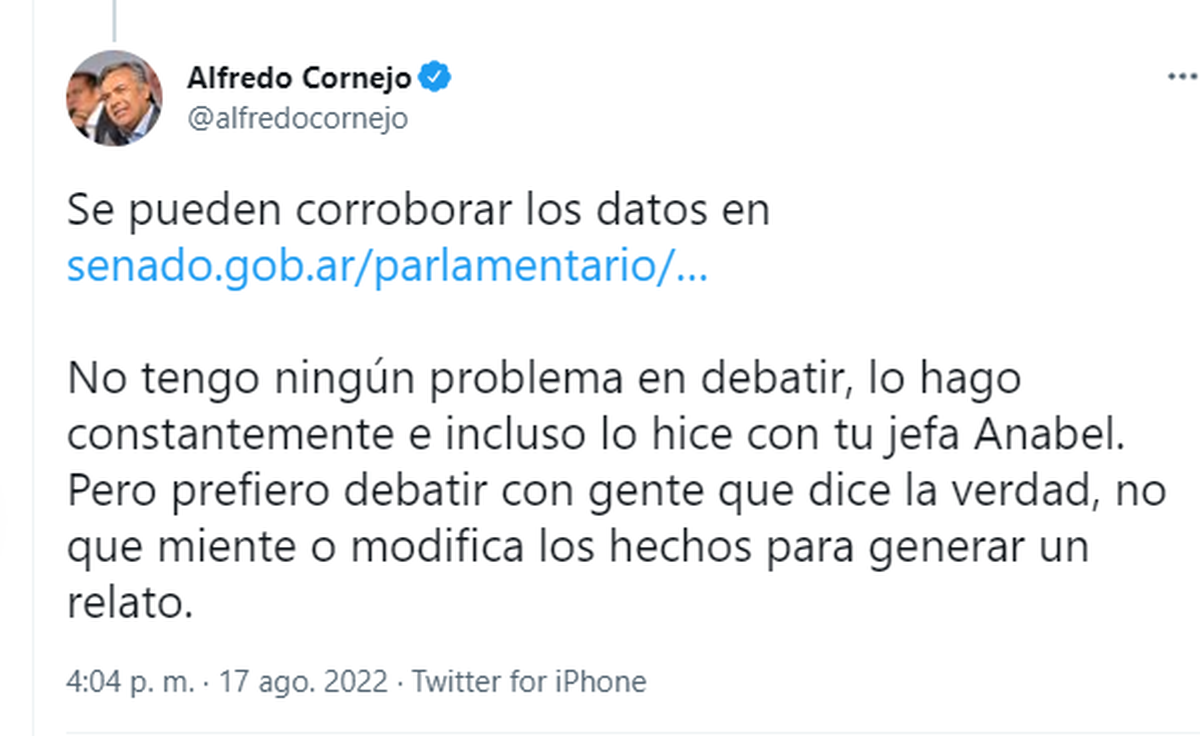 A esta afirmación, Cornejo respondió inmediatamente, también utilizando su cuenta oficial de Twitter.