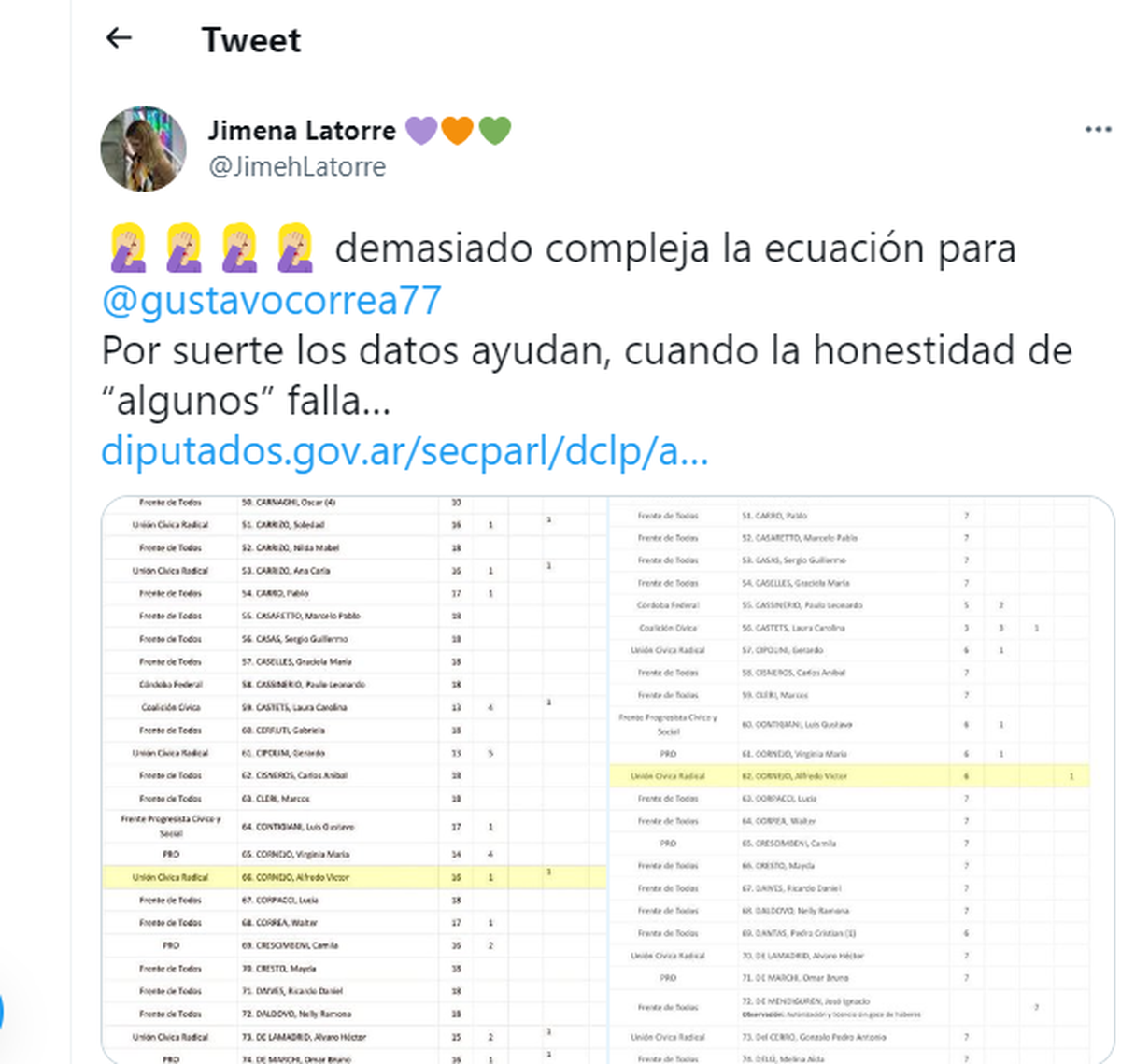 Dos diputadas provinciales por Mendoza, Jimena Latorre y Pamela Verasay (UCR) tuitearon los datos de las asistencias de Cornejo en Diputados.