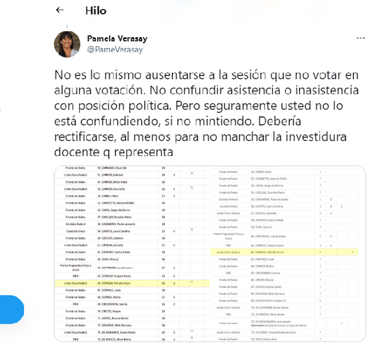 Al respecto, Verasay se refirió a la profesión de Correa, diciendo que hay que hacer docencia con él y explicarle que un legislador puede estar presente y no votar, puesto que el "no voto" es una posición política.