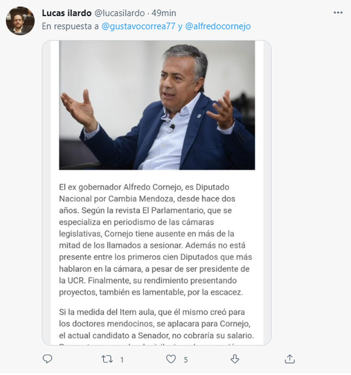 Pero el fuego cruzado siguió. Según aclaró Correa, las inasistencias a las que él se refiere ocurrieron en la Cámara De Diputados de la Nación, en el período en el que Cornejo ocupó allí una banca.