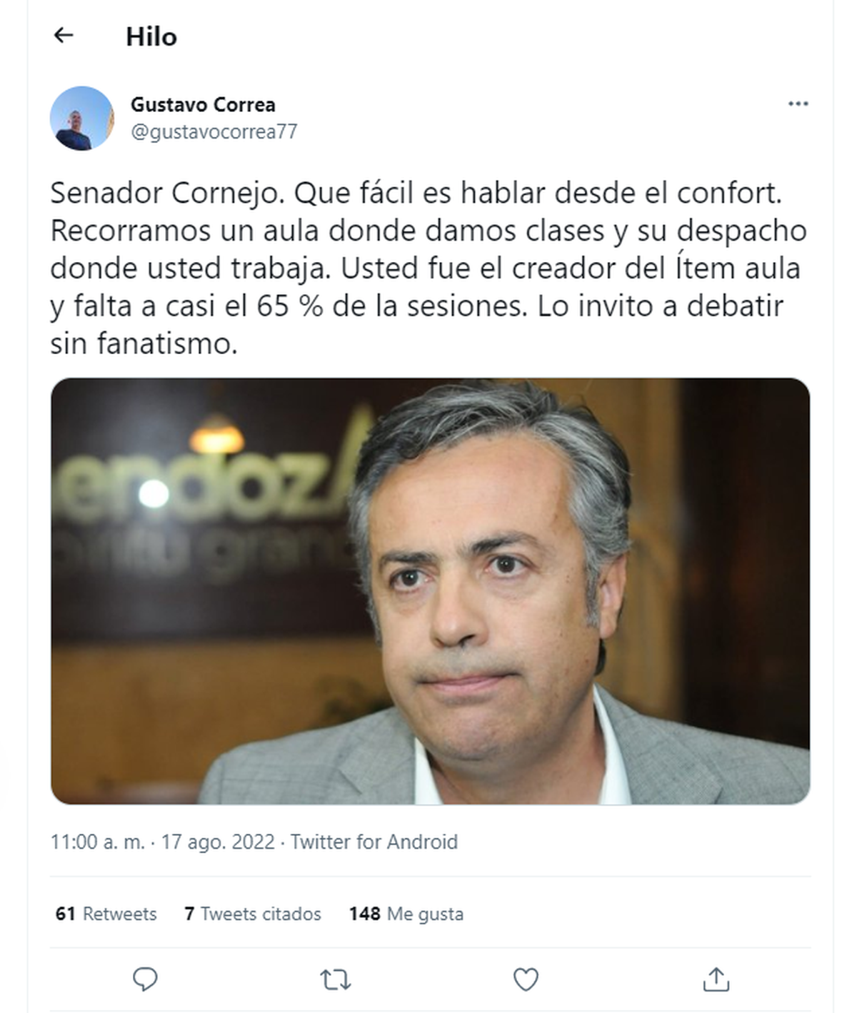 La pelea por los salarios que está librando el SUTE y el Gobierno de Mendoza, se trasladó a las redes sociales. Esta vez, fue el secretario gremial del SUTE, Gustavo Correa, quien respondió a las duras críticas que les hizo el senador nacional y exgobernador de Mendoza, Alfredo Cornejo.