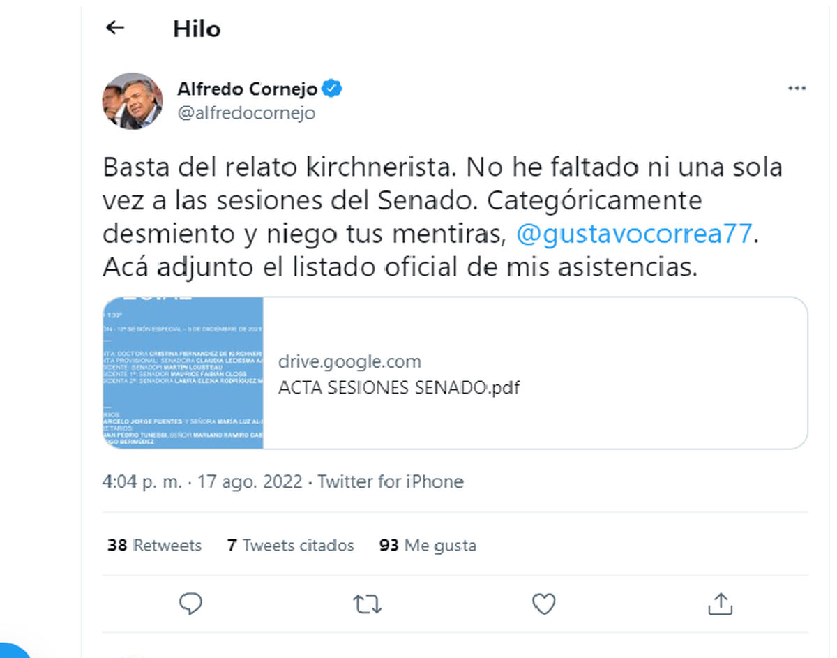 En tanto, la respuesta de Cornejo no se hizo esperar. Dijo que Correa miente porque él no ha faltado a una sola sesión. De hecho, dos legisladoras nacionales, Pamela Verasay y Jimena Latorre, mostraron las asistencias de Cornejo en el Congreso, para mostrar que no tiene faltas, ni en Diputados, ni en el Senado.