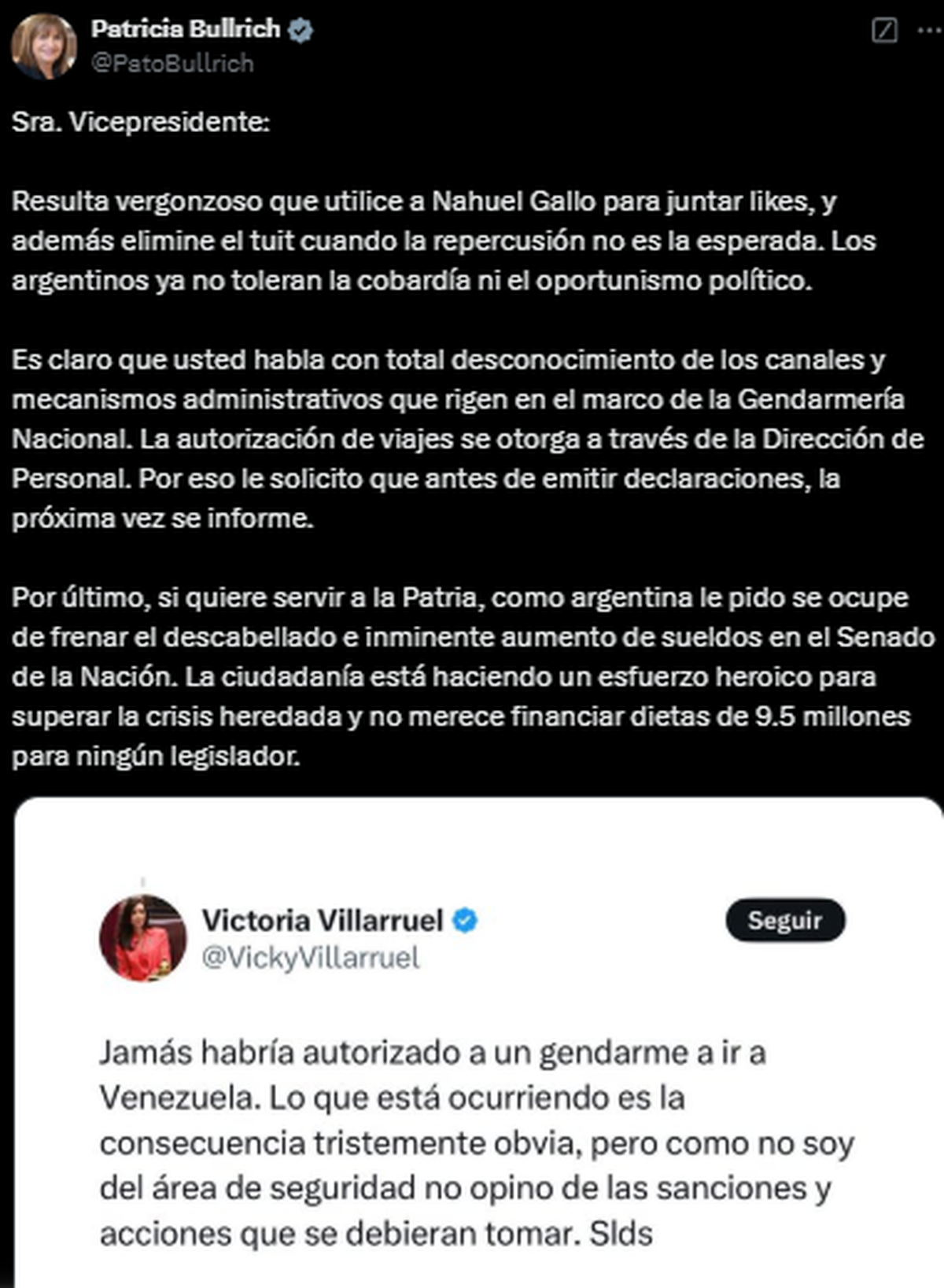 Villarruel se había manifestado en X en contra de la decisión de permitirle al gendarme Gallo viajar a Venezuela, donde está detenido por "terrorismo". Luego eliminó su opinión, pero Bullrich utilizó una captura y la dejó más expuesta en las redes sociales.
