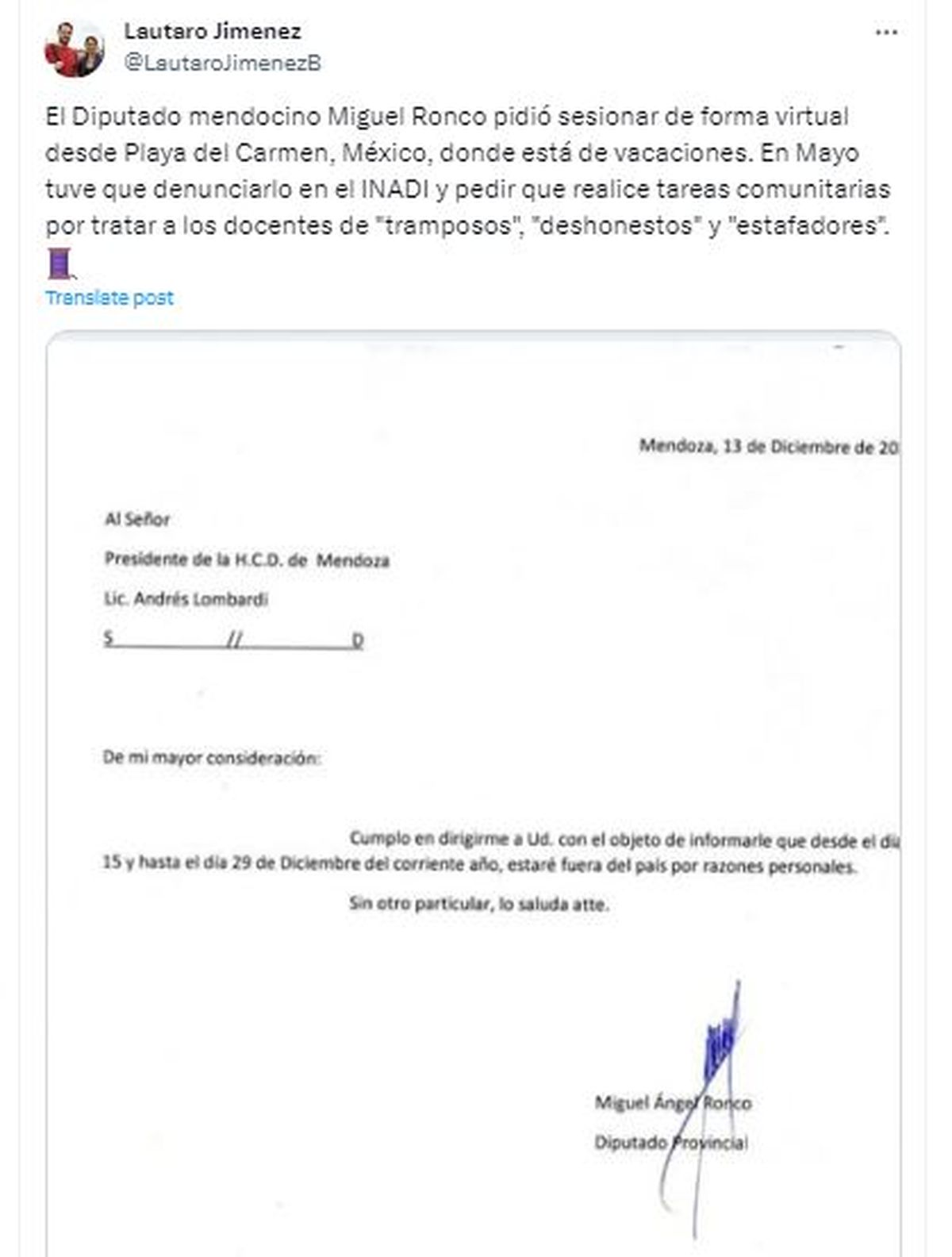 Uno de los primeros que salió a repudiar el gesto político de Ronco fue el ex senador del FIT, Lautaro Jimenez, quien además publicó la nota que Ronco mandó a la Cámara de Diputados notificando su salida del país.