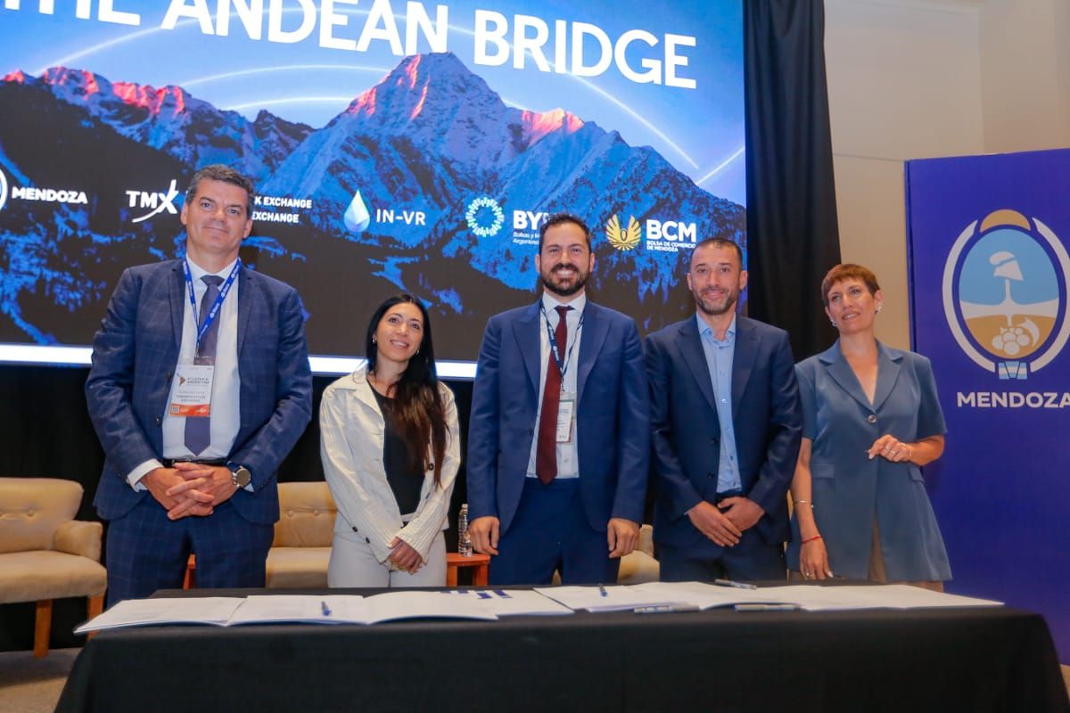 Según explicó, este paso le permitirá a la región andina “pensar en un horizonte certero de inversiones”. El acuerdo fue firmado también por Luis Romano, presidente de la Bolsa de Comercio de Mendoza; Guillaume Legare, director para Sudamérica de la Bolsa de Valores de Toronto (TSX); Julieta Artal Conte, líder de Gobierno Corporativo y Sustentabilidad de BYMA, y Stelios Papagrigoriou, presidente de IN-VR.
