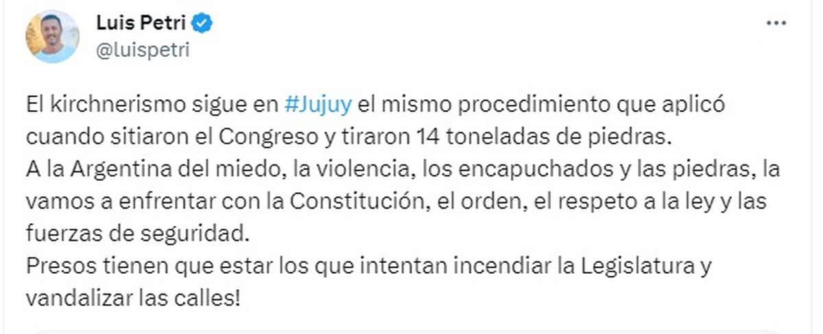 Quien compitió con Cornejo en las recientes PASO, Luis Petri (UCR), se expresó en sentido similar y ratificó que una de las banderas de Juntos por el Cambio sigue siendo la utilización concreta de las fuerzas de Seguridad ante situaciones como la jujeña.